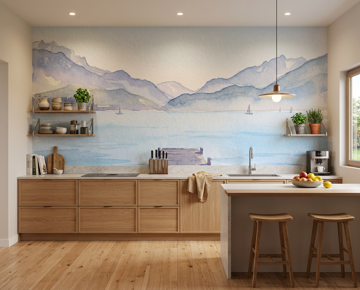 Papier peint panoramique inspiré du lac d’Annecy, représentant un ponton en bois qui s’avance vers un lac bleu entouré de montagnes alpines. Ce décor mural au style aquarelle crée une impression de profondeur naturelle et transforme instantanément la pièce en un espace ouvert et apaisant.