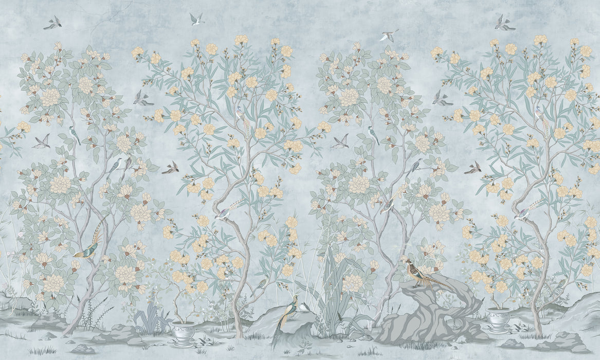 Este papel pintado panorámico Chinoiserie garden bleu realza las decoraciones y tranquiliza los ambientes. ¿Busca un ambiente zen y verde? Entonces, ¡este papel pintado a medida es para usted!
