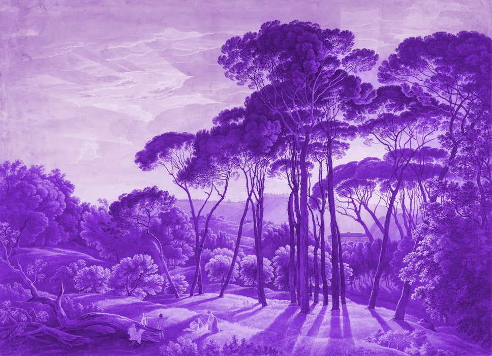 Papel pintado de paisaje italiano de color morado, este papel pintado panorámico a medida es perfecto para interiores elegantes y contemporáneos con un diseño antiguo. Lo hemos creado en color morado para aportar modernismo y dinamismo a este mural artístico. Compre papel pintado panorámico en línea para personalizar su interior. En un salón, un dormitorio o un despacho, esta decoración mural panorámica aportará estilo y un toque sofisticado a su decoración. Descubra este famoso e histórico paisaje italiano con pinos paraguas, una pintura de Hendrik Voogd1807. Un papel pintado panorámico bañado en luz dorada y emoción.