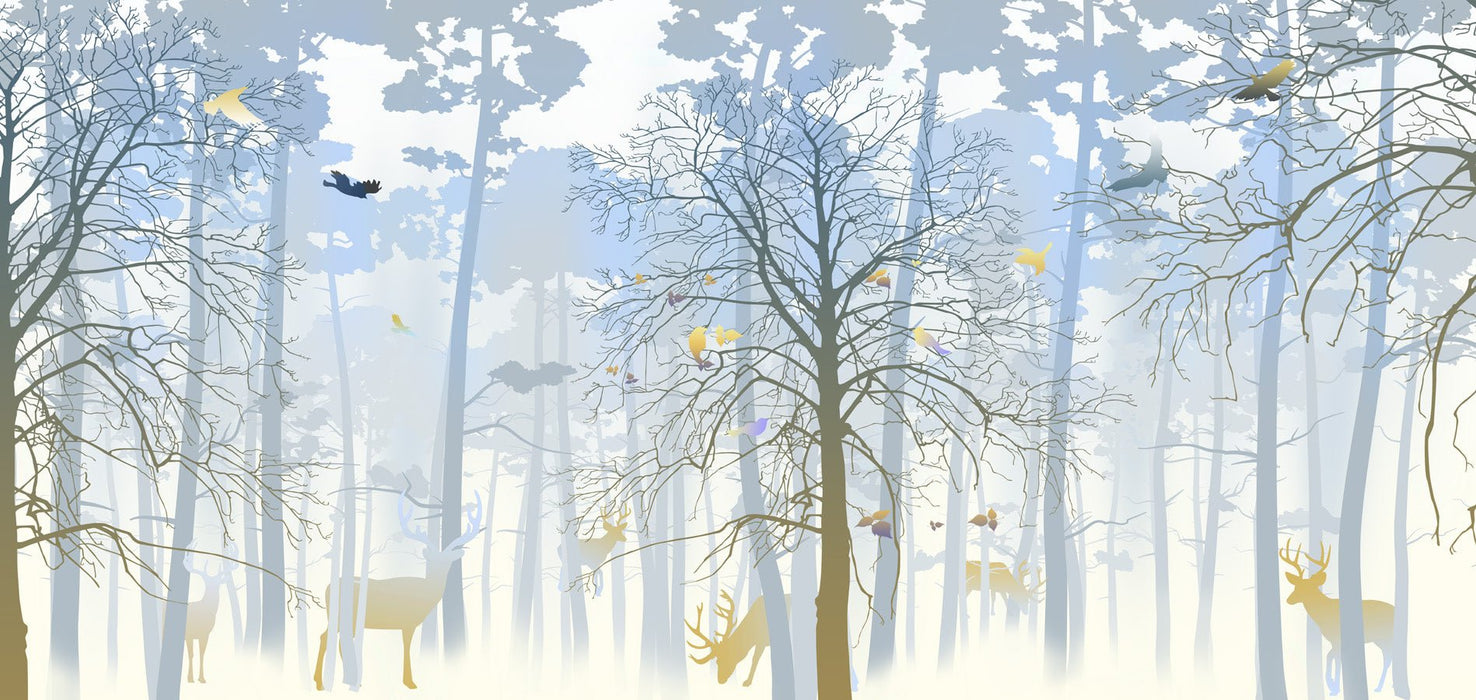 Exclusiva colección de papel pintado no tejido panorámico con aspecto de bosque, ciervo y cierva.