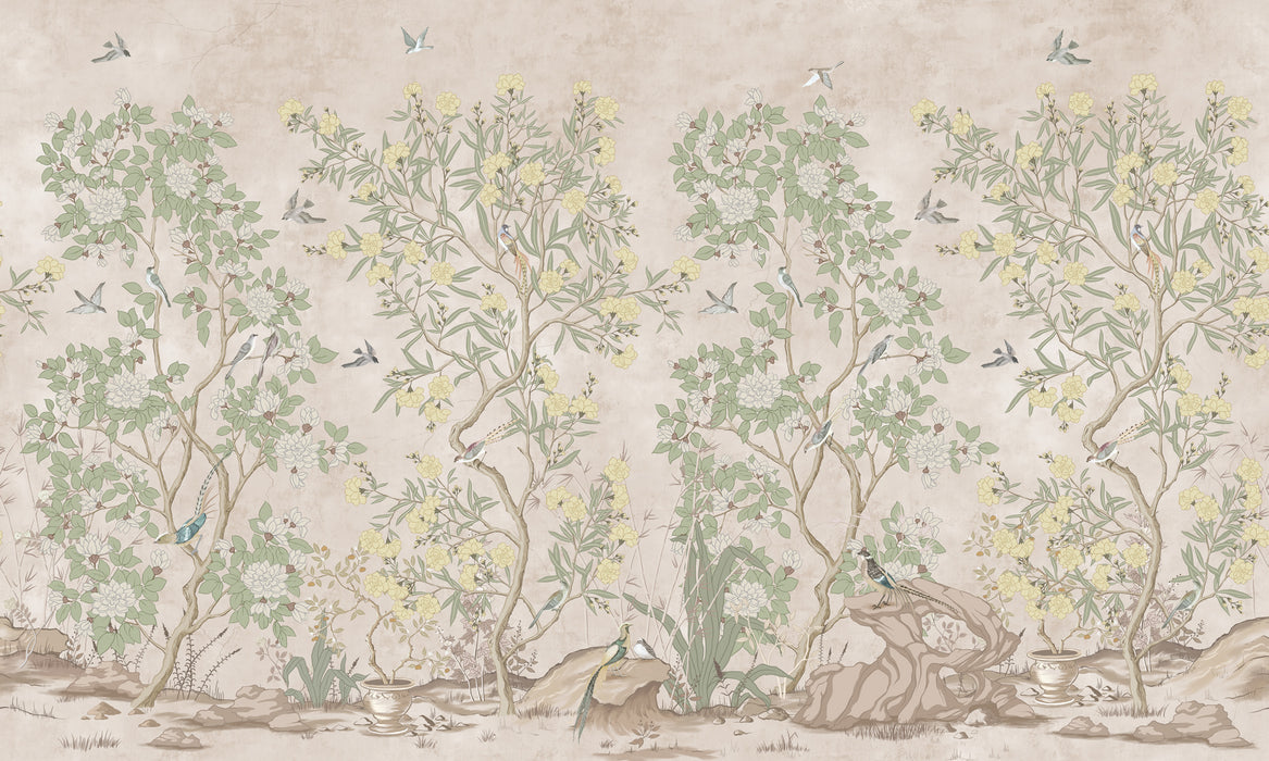 Este papel pintado chinoiserie representa una decoración vegetal y floral, con colores suaves y pastel. Los pájaros acompañan este cuadro para aportar suavidad y originalidad.