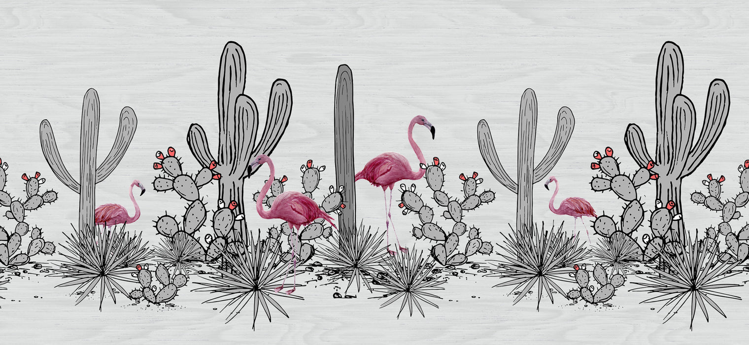 Papel pintado Panorámica de cactus y flamencos rosas
