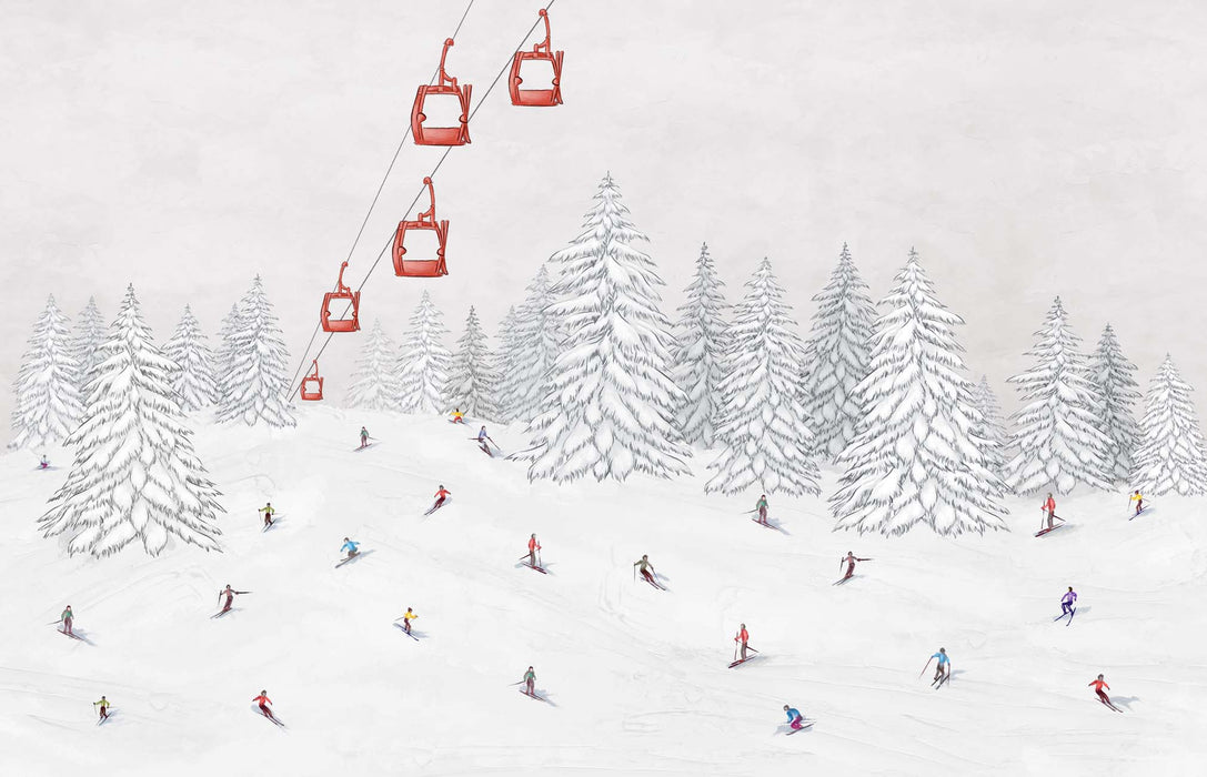 Este diseño de pared presenta montañas, nieve y un cielo ligeramente brumoso, con góndolas en colores vibrantes y esquiadores tal y como nos gustan.
