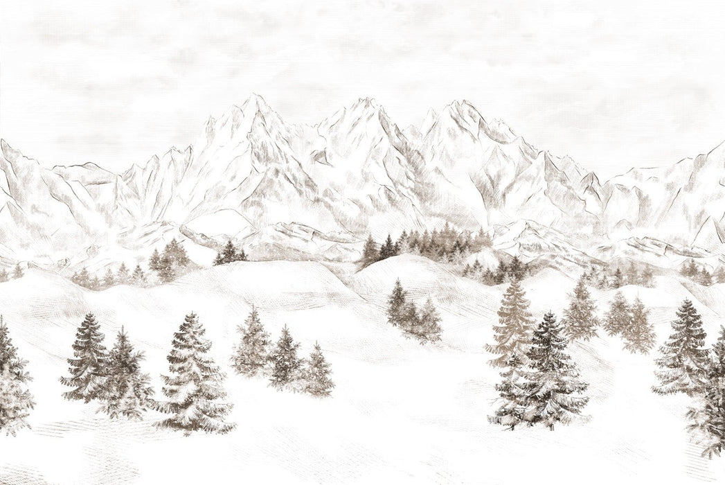 Nieve, abetos, una decoración mural mágica que realzará su interior. Este mural le invita a un ambiente tranquilo y sereno. Cree un ambiente inspirador y relajante con nuestro papel pintado a medida, un color sepia para dar calidez a su interior.