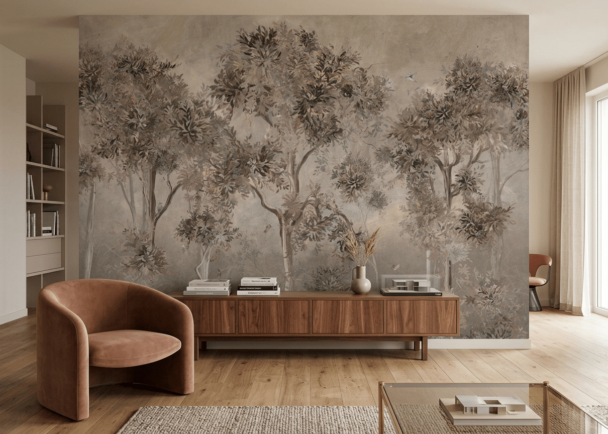 Ce papier peint mural contemporain transforme votre pièce en un espace élégant, apaisant et connecté à la nature, parfait pour une décoration intérieure tendance et intemporelle.