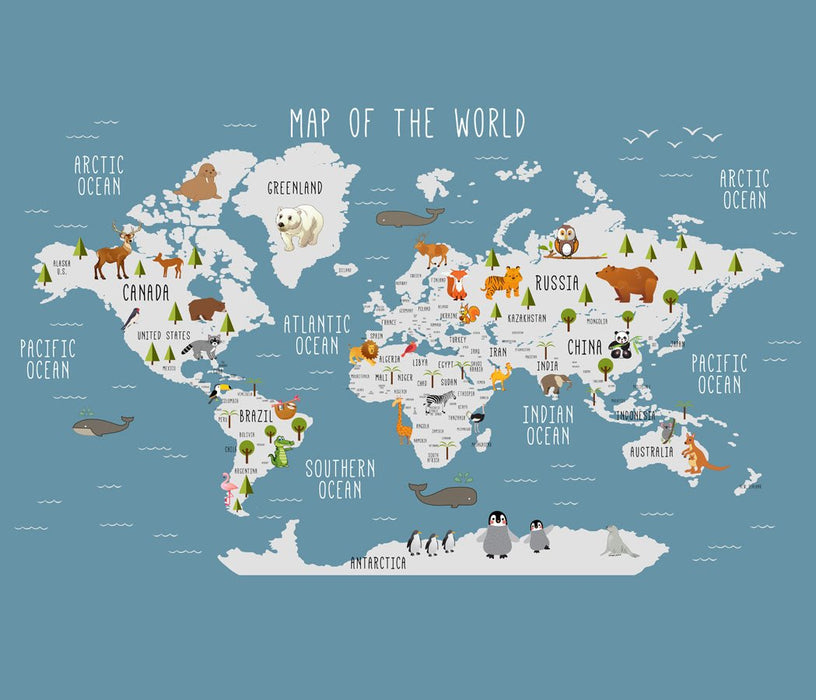 Este papel pintado Mapamundi ilustrado con animales en azul oscuro es perfecto para decorar el dormitorio de un niño de forma lúdica. Los colores pastel y los animales del mundo aportarán un estilo suave y una atmósfera propicia a la relajación. Un magnífico conjunto visual para fascinar y entretener a los niños. Es fácil crear una decoración lúdica e infantil con este papel pintado personalizado. Su decoración mural se imprime sobre un papel pintado impermeable con efecto de tejido sedoso brillante.