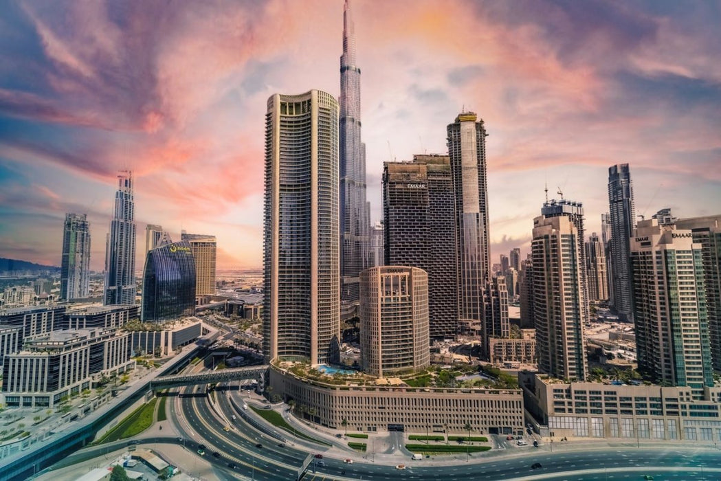 Fondo de pantalla panorámico de la puesta de sol en Dubai