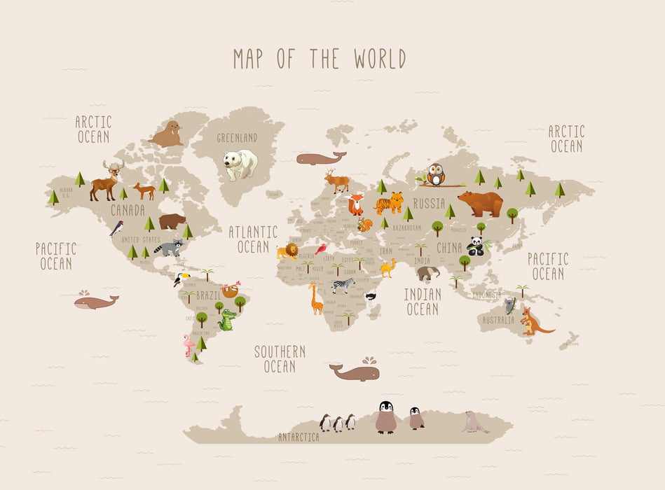 Este papel pintado beige Mapamundi ilustrado de animales es perfecto para decorar de forma lúdica el dormitorio de un niño. Los colores pastel y los animales del mundo aportarán un estilo suave y un ambiente propicio a la relajación. Un magnífico conjunto visual para fascinar y entretener a los niños. Es fácil crear una decoración lúdica e infantil con este papel pintado personalizado. Su decoración mural se imprime sobre un papel pintado impermeable con efecto de tejido sedoso brillante.
