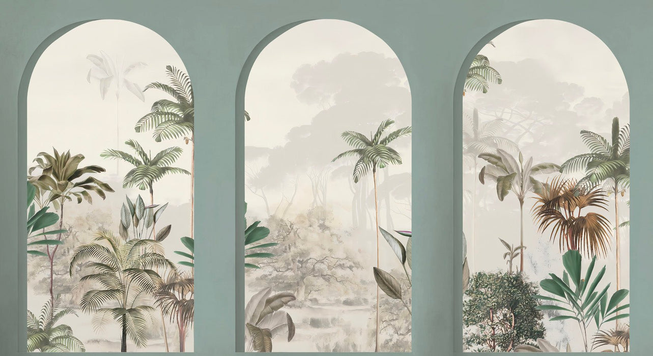 Los majestuosos arcos parecen invitarle a explorar la exuberante y verde naturaleza. El exuberante follaje y las plantas tropicales llenan todos los rincones, añadiendo un toque de frescura y vida a la decoración de sus paredes. Déjese transportar a un mundo donde la exuberante vegetación crea una atmósfera relajante e inspiradora.