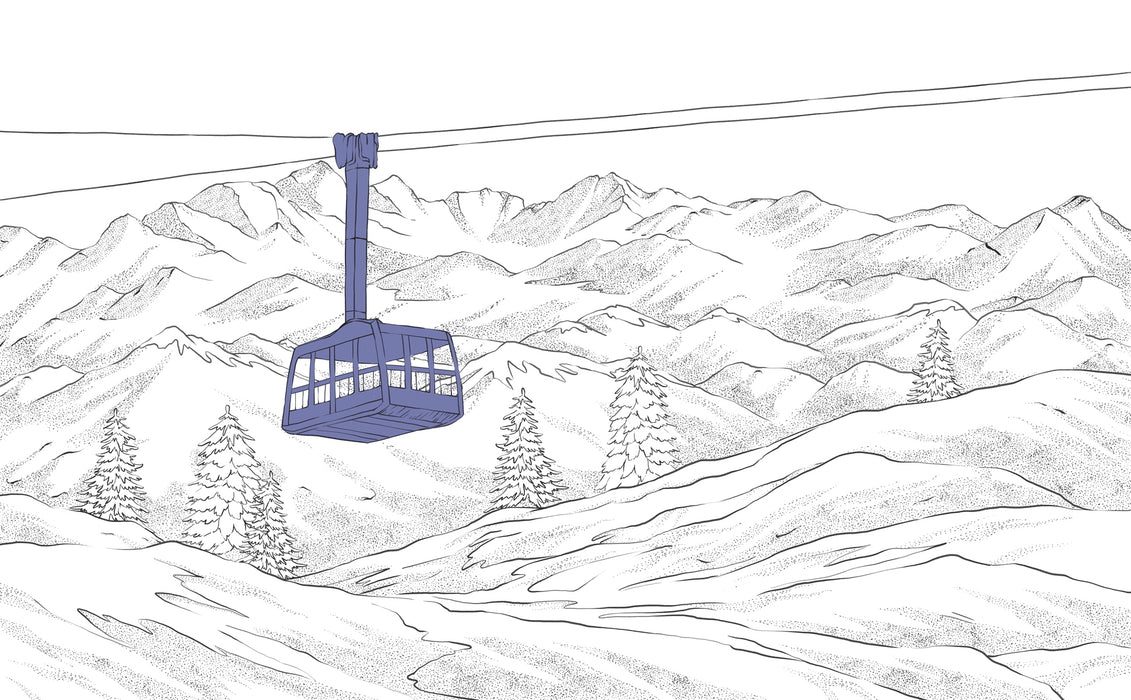 Este diseño mural predominantemente blanco y negro, con una góndola azul, presenta montañas, nieve, abetos y una resplandeciente góndola. Gane altura con su nuevo papel pintado a medida. Elija una decoración original con un elemento decorativo azul.