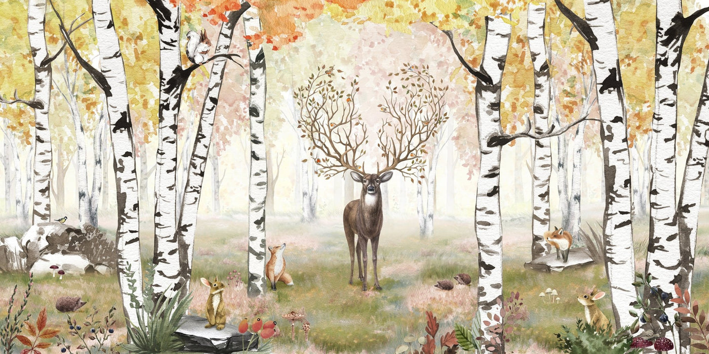Con el papel pintado infantil Bosque mágico, sumérjase en un mundo de cuento de hadas diseñado y pensado especialmente para llenar de asombro las habitaciones de bebés y niños. Esta representación abstracta de un bosque hechizante cautiva los corazones con esbeltos abedules, flores brillantes y una adorable fauna que incluye conejos, pequeños pájaros y un curioso zorro. En el centro de esta encantadora escena, reina un magnífico ciervo con astas florecidas.