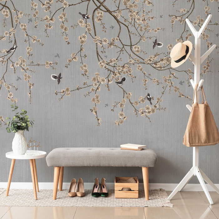 Las delicadas urracas añaden un toque de encanto a estas ramas, mientras que las delicadas flores que florecen aportan un ambiente refinado y floral a su espacio. Este papel pintado de ramas en flor transforma instantáneamente su habitación en un lienzo artístico, aportando a la vez una dimensión visual y un sutil toque de naturaleza. El color de fondo del papel pintado tiene una textura visual, añadiendo un toque retro a su decoración.