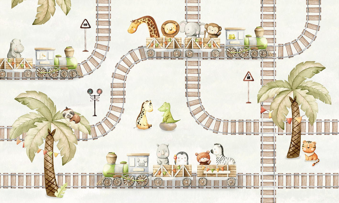 El papel pintado de viaje para bebés Tchou-Tchou le ofrece un nuevo tipo de decoración mural: ¡una vía de tren en la pared! ¡No se moleste más con una alfombrilla de circuito y opte por nuestro nuevo papel pintado! Con sus pequeños coches y figuras, ¡su hijo dispondrá de una enorme zona de juegos! Este divertido papel pintado para bebés es ideal. Los suaves colores pastel de este papel pintado suavizarán el ambiente de la habitación de su hijo. Unámonos a los simpáticos animales y viajemos juntos por el mundo.