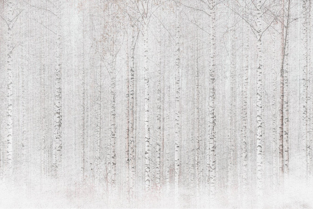 Descubra el envolvente papel pintado Bosque de abedules. Este papel pintado combina un efecto trampantojo con grafismos y materiales. Este papel pintado panorámico representa un bosque de abedules abstracto, perfectamente concebido para hacer su interior acogedor.