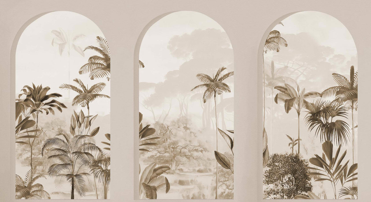 Sumérjase en el corazón de la exuberancia tropical con nuestro exuberante papel pintado de arcos. Este cautivador diseño presenta arcos envueltos en una exuberante vegetación, evocando un encantador viaje a través de una selva exótica. Cada detalle de este papel pintado sepia está cuidadosamente diseñado para crear una atmósfera envolvente y revitalizante en su espacio interior.