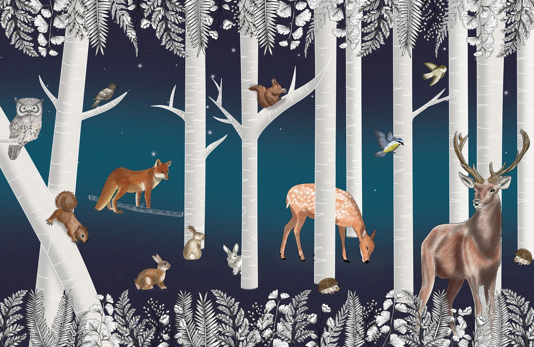 Papel pintado infantil Bosque encantado y sus animales Noche estrellada