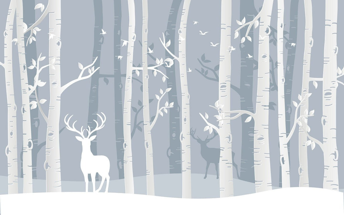 Papel pintado infantil bosque escandinavo de abedules y ciervos
