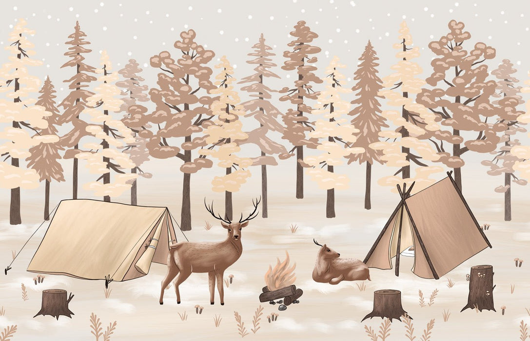 Un abeto cubierto de nieve, un ciervo majestuoso, una hoguera mágica, este papel pintado infantil escandinavo sueco de cuento de hadas nos transporta a un mundo de ensueño. Este papel pintado en forma de mural es artístico, mágico y de cuento de hadas. Los colores de este tapiz panorámico son relajantes. Esta decoración mural es suave, tierna y evasiva.