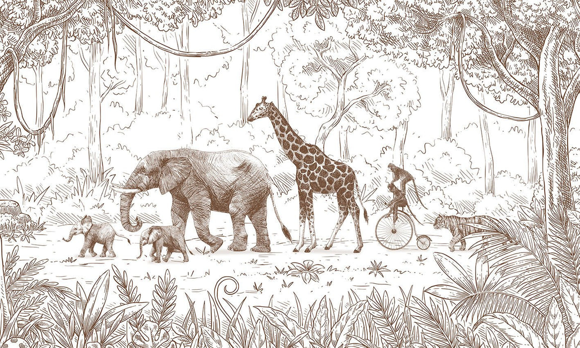 El papel pintado infantil jungla monocromo en sepia es el papel pintado ideal para decorar con gusto y personalización el dormitorio de su hijo. Este papel pintado infantil jungla panorámico se realiza a medida, para un resultado sorprendente y sublime. Un fresco mural infantil que representa animales de la sabana: elefantes y jirafas para contar a su hijo bellas historias.