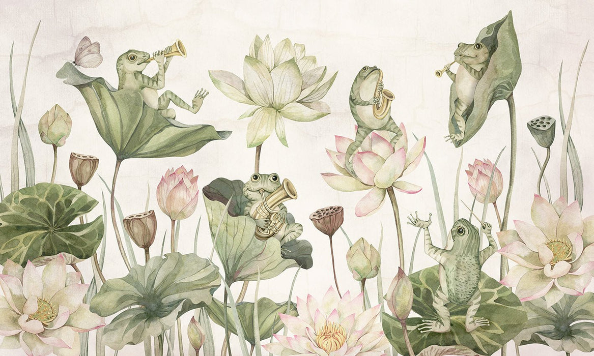 El dormitorio de su hijo se llenará de swing con este papel pintado de ranas musicales. Este papel pintado infantil presenta unas simpáticas ranas haciendo música entre flores y nenúfares. Gracias a sus suaves colores pastel, este dinámico papel pintado tranquilizará a su hijo cuando duerma la siesta o descanse. Ideal para el dormitorio de un bebé, esta decoración mural despertará sus sentidos y desarrollará sus facultades sensoriales.