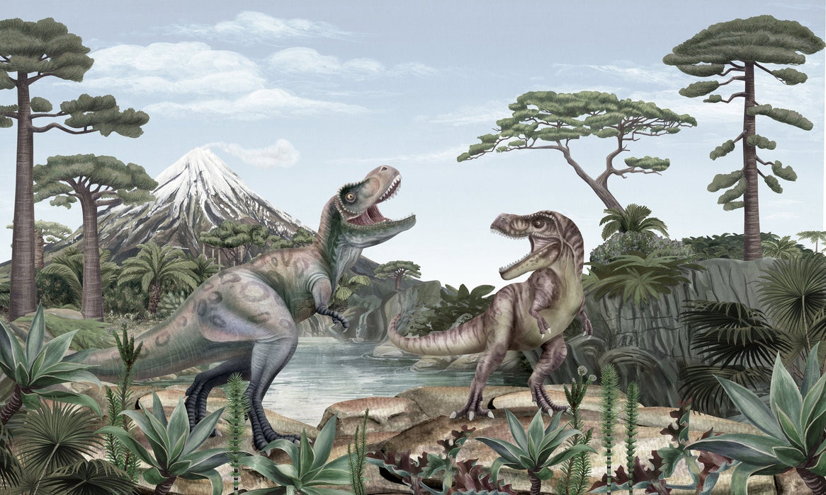 Este papel pintado a medida presenta a dos dinosaurios, la familia t-rex, que se dedican a sus quehaceres en el bosque. De fondo, encontrarás vegetación, un lago y una montaña, para una inmersión total en este universo.