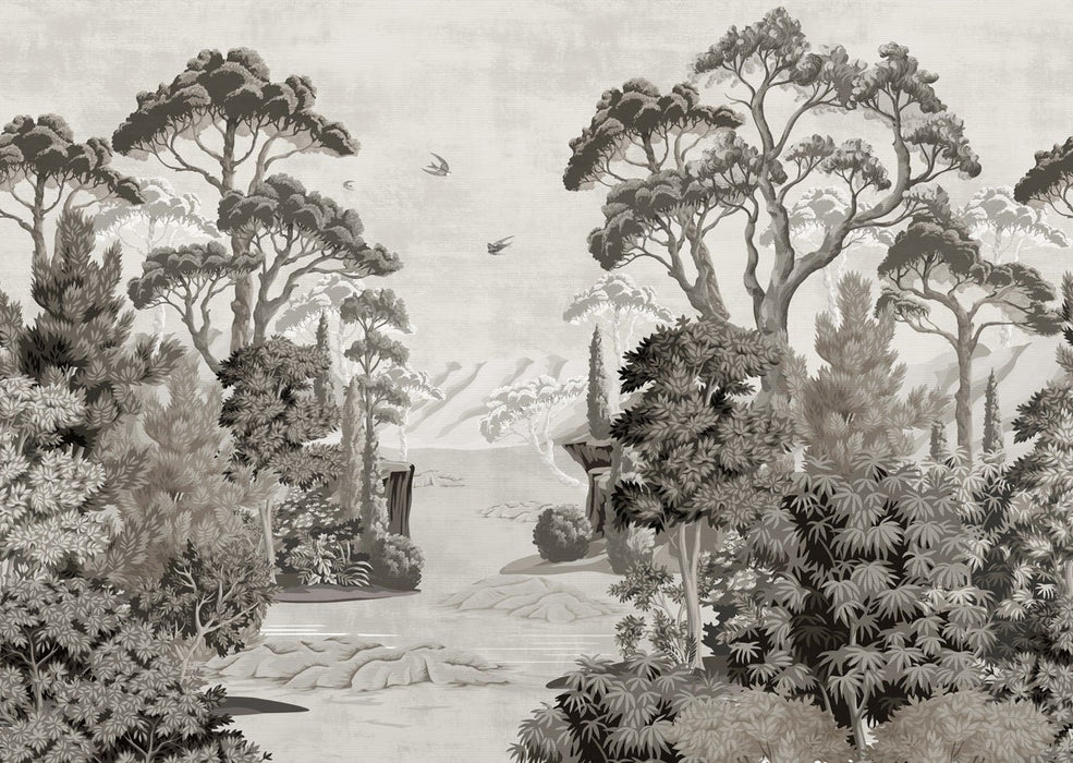 Motivo acuarela, pintura de un paisaje antiguo, este papel pintado panorámico realzará su interior aportándole elegancia y carácter. En monocromo para aportar elegancia y refinamiento a su interior, el papel pintado de estilo antiguo es ideal para dormitorios, salones y entradas. Con este mural hecho a medida, podrá crear un interior chic. Este mural de pared es una ilustración retro revisitada y modernizada para adaptarse a los interiores actuales conservando un toque elegante de antaño. El tema blanco y negro combina a la perfección con objetos decorativos de madera, ratán, bambú y molduras Haussmann.