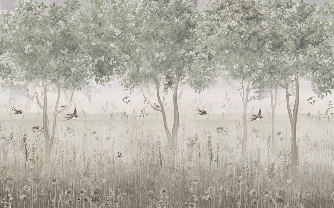 Sus suaves tonos verdes, beige brumoso y gris poético aportan una sensación de equilibrio y suavidad, perfecta para una decoración natural y atemporal. Cada detalle, desde las flores del campo hasta las golondrinas en pleno vuelo, evoca un paseo matutino por un paisaje virgen.