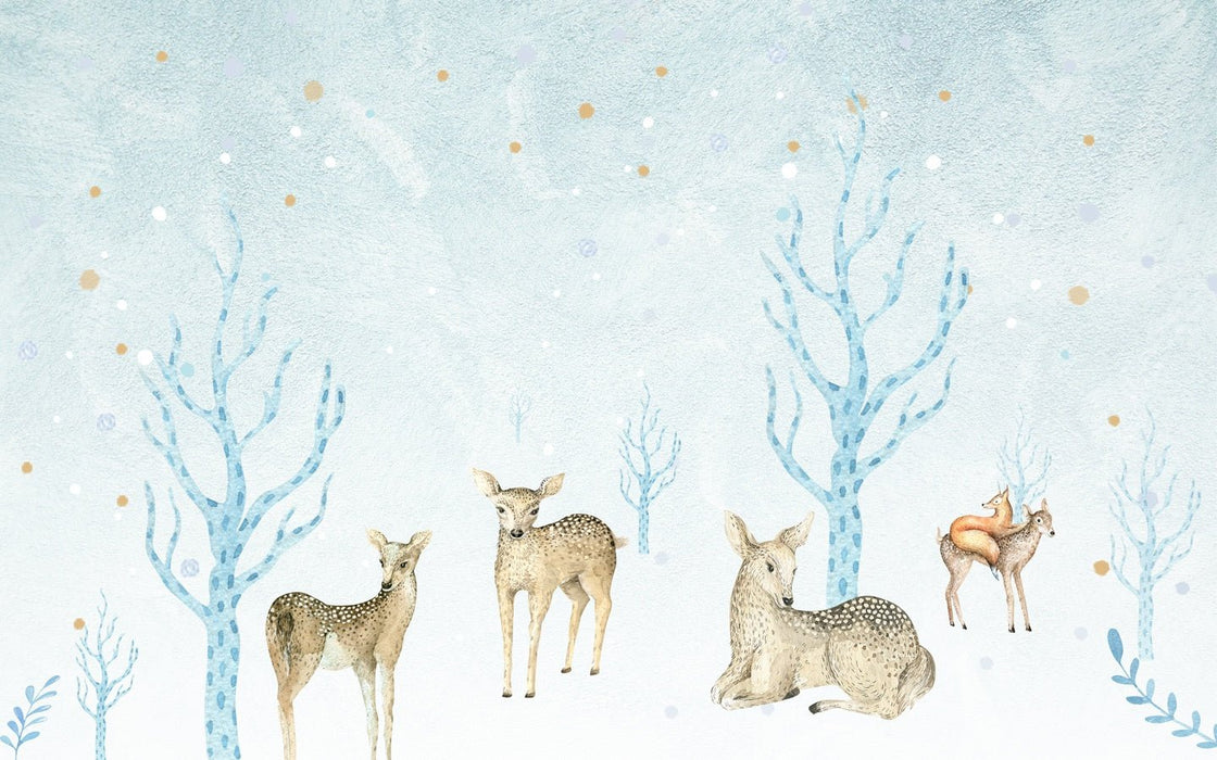 Papel pintado para habitación de bebé en azul bosque y ciervo