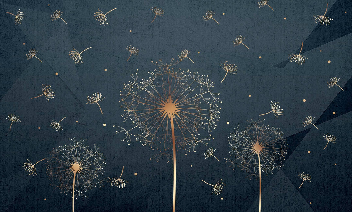 Sumérgete en un entorno azul profundo, con nuestro profundo diente de fondo de diente de león y azul, que te abre hacia otro horizonte. Un fondo de pantalla con patrones minimalistas con diente de león dorado. Impresionará a sus invitados con su profundidad y su elegancia. Cree una atmósfera pacífica y brillante gracias a este fondo de pantalla a sus medidas.