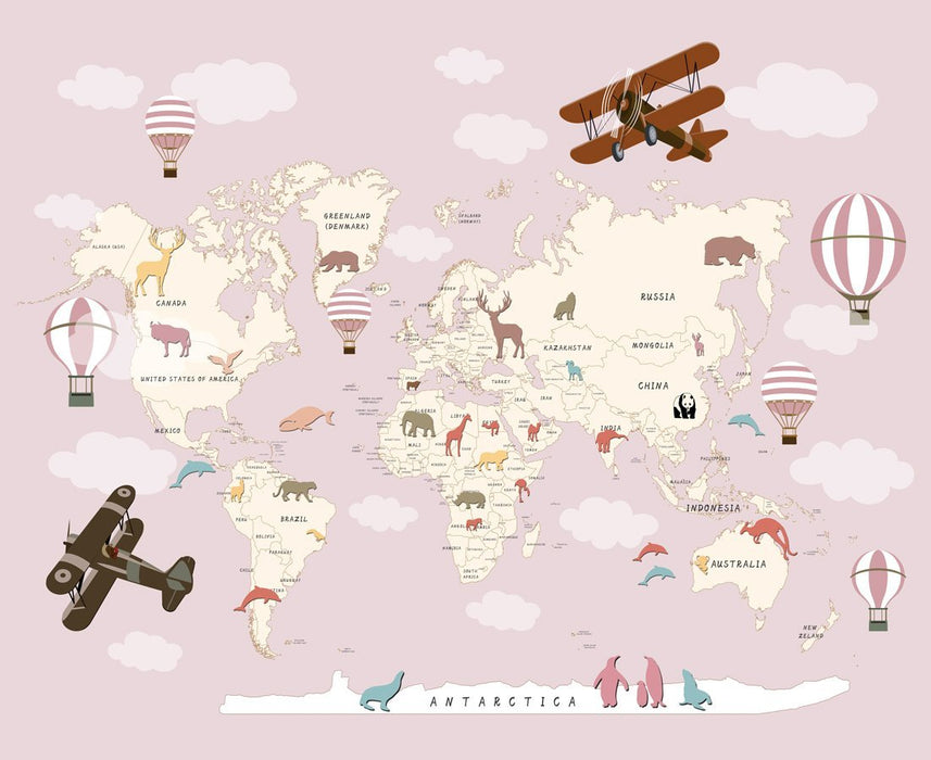Optimice la decoración de la habitación de su hijo con nuestro fondo de pantalla "World Plane Girl". Sus colores pastel e ilustraciones de animales en todo el mundo ofrecen un estilo suave y una atmósfera propicio para la relajación. Perfecto para los niños cautivadores y entretenidos, este conjunto visual es una invitación para viajar y explorar. Cree fácilmente una decoración de niños y diversión optando por este papel tapiz panorámico personalizado. Se adapta a todas las configuraciones de pared, ofreciendo así una flexibilidad total en el diseño de su espacio.