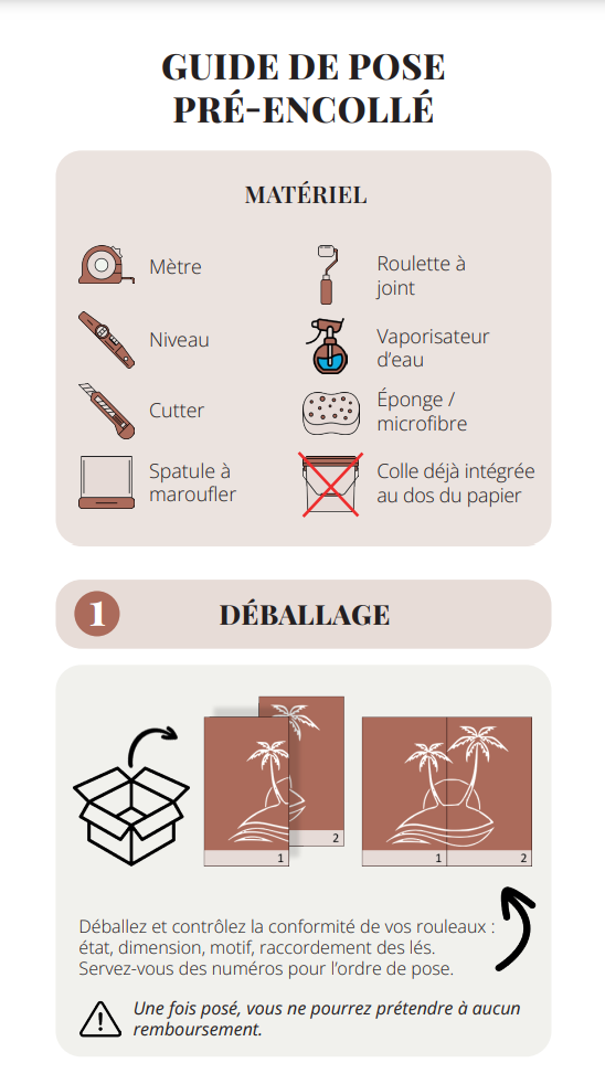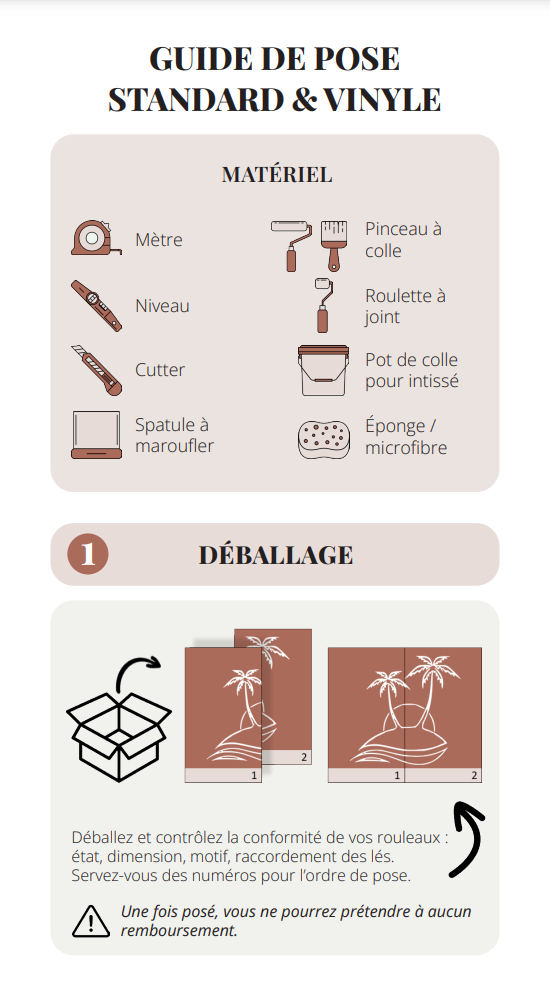 Ha pedido un papel pintado panorámico a medida impreso sobre un soporte no tejido SOFT TOUCH o VINYLE PRO. Haga clic en la imagen para descargar la guía de instalación que le ayudará a instalar su nuevo papel pintado.