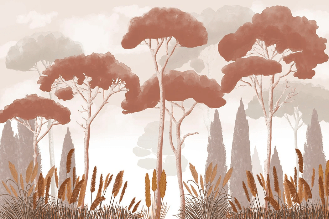 Papel pintado con cipreses, pinos y hierba de la pampa en color terracota