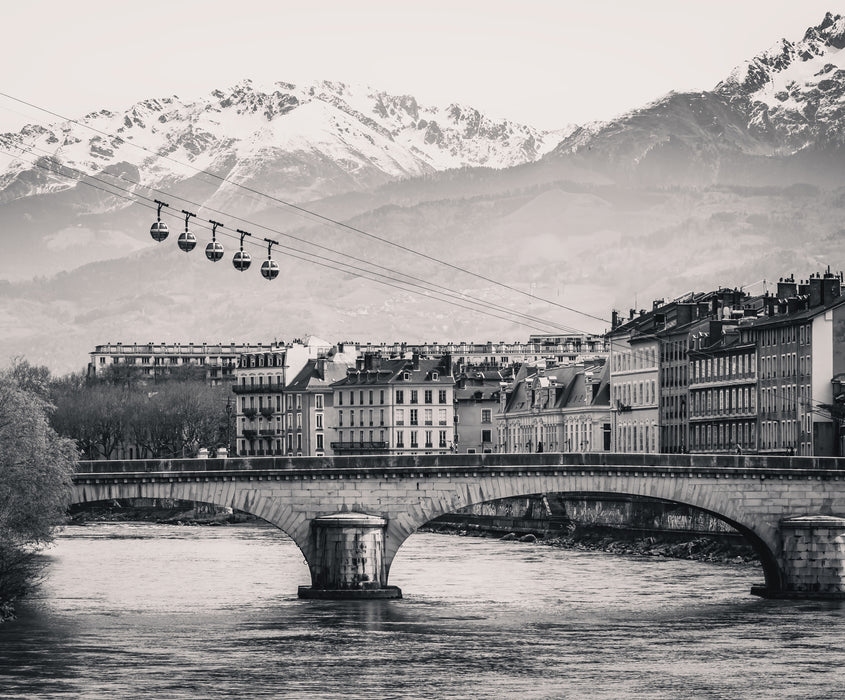 Aporte un toque de elegancia urbana a su interior con este papel pintado panorámico en blanco y negro de Grenoble, que muestra la famosa Bastilla dominando la ciudad con las burbujas. Ideal para crear un ambiente contemporáneo, este diseño de gran formato transforma su pared en una auténtica ventana artística a los Alpes.