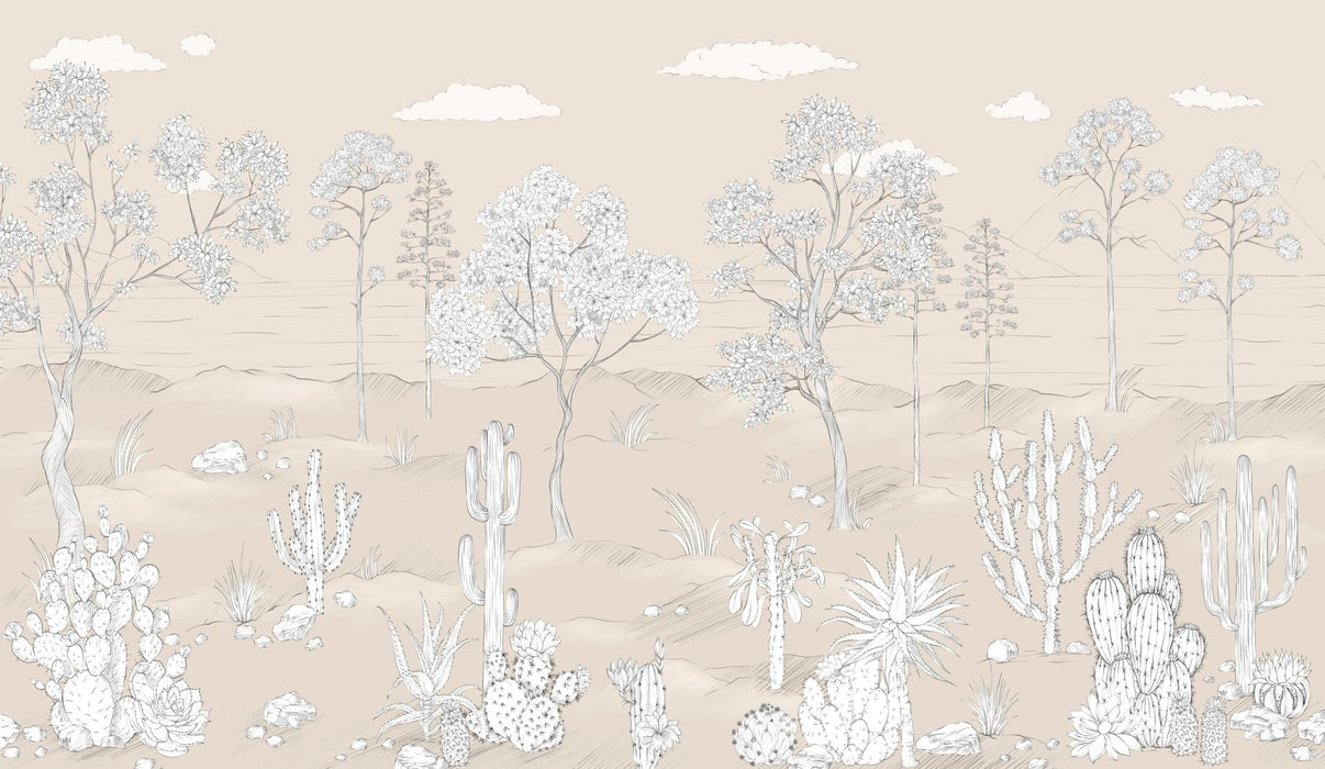 Transforme su interior con nuestro papel pintado oasis tropical de cactus. Inspirado en México, y más concretamente en la ciudad de Oaxaca, este papel pintado panorámico realza sutilmente cualquier decoración. Este papel pintado tropical es un papel pintado a medida que va a todas partes gracias a sus tonos claros de beige y sus delicados motivos de cactus y vegetación. Atrévase con una nueva decoración mural original y elegante con nuestro nuevo papel pintado cactus panorámico.