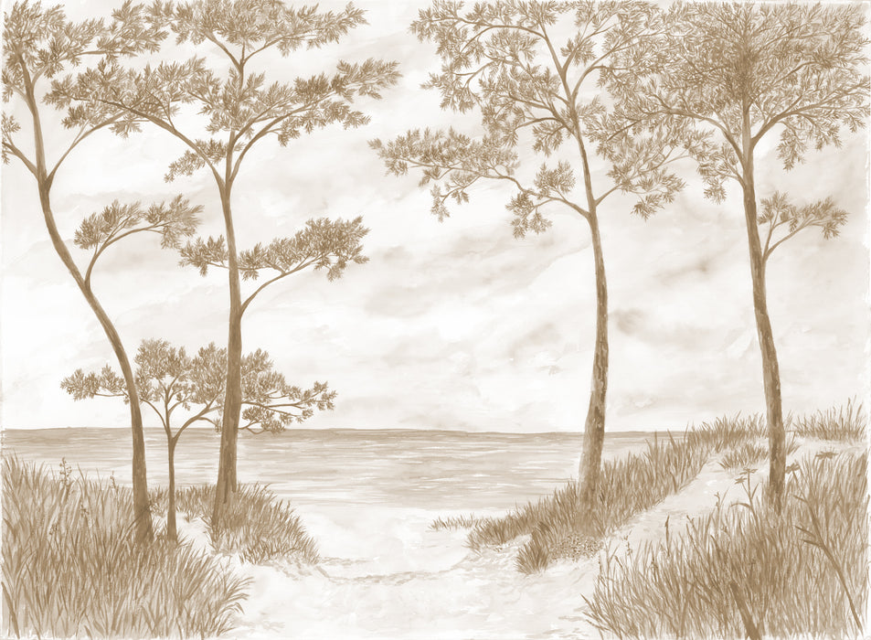 Dote a sus paredes de una obra mural prestigiosa y atemporal. Pida ahora su papel pintado panorámico sepia inspirado en la costa vasca y las Landas, una creación única de la artista Flora Lacour Filliol.