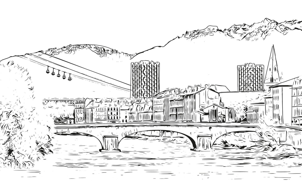 Este papel pintado ilustrado en blanco y negro representa una vista emblemática de Grenoble, una ciudad enclavada en el corazón de los Alpes franceses. En él se distinguen varios elementos característicos:
