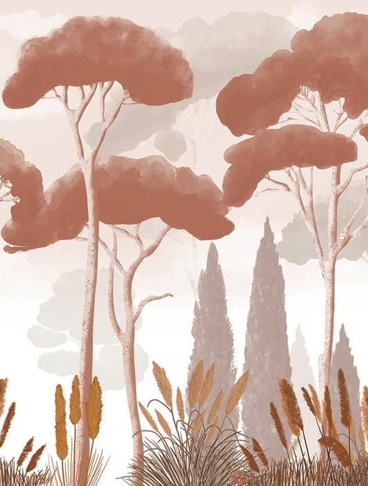 Papier peint cyprès pins et herbes de la pampa terracotta
