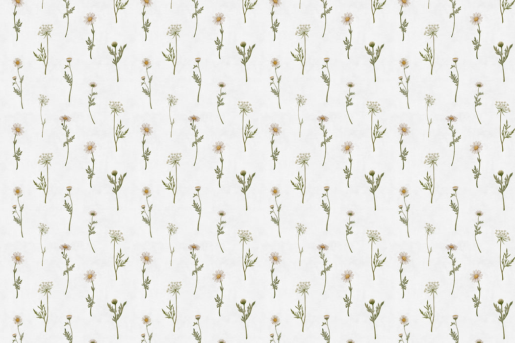 Ce papier peint floral pour chambre bébé et enfant transforme les murs en une prairie délicate et lumineuse. Comme une promenade au cœur d’un champ de fleurs, le décor dévoile de fines marguerites, de petites fleurs sauvages et des tiges élancées illustrées avec finesse.
