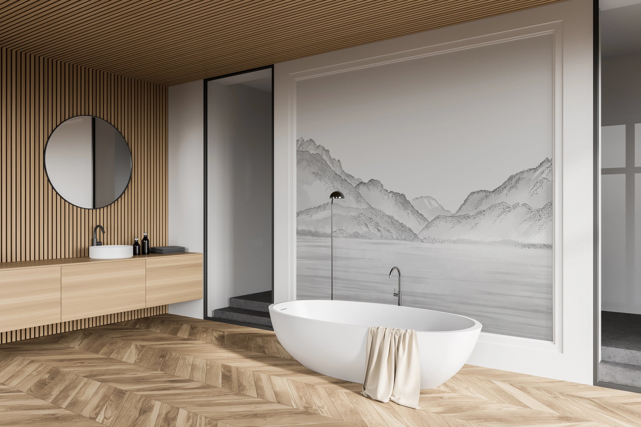 Cette tapisserie sur mesure, sélectionnée par des architectes pour son esthétique raffinée, offre une profondeur unique et un style contemporain qui s’intègre parfaitement aux chalets modernes, résidences haut de gamme et espaces professionnels.